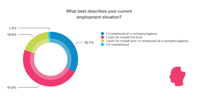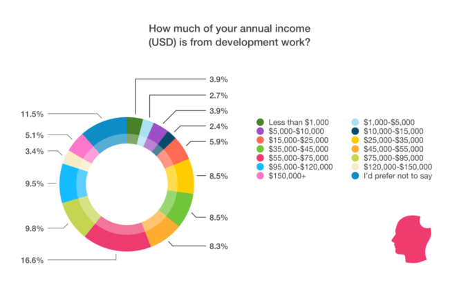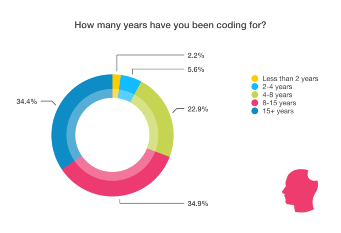 48% des développeurs interrogés sont à leur compte à temps plein et 33% travaillent en entreprise. 18% d’entre eux cumulent ces deux statuts. La majorité des entreprises (71%) dans lesquelles travaillent ces développeurs appartiennent au secteur du développement ou de la conception web, les autres secteurs populaires étant ceux des médias, de la publicité / marketing, de l’édition ou du divertissement.