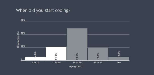 Les développeurs commencent à coder plutôt jeune : 4,8% entre 5 et 10 ans, 21% entre 11 et 15 ans, 50% entre 16 et 20 ans et 20% entre 21 et 25 ans.