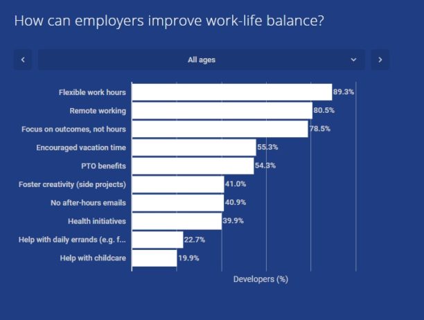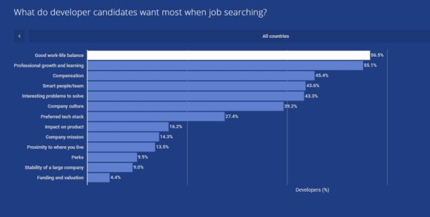 Lors de leur recherche d’emploi, les devs veulent principalement 3 choses : un bon équilibre vie pro / perso (56,5%) ; la possibilité d’apprendre et de progresser (55,1%) ; la rémunération (45,4%).