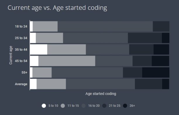 Il est intéressant de constater que ce sont les développeurs les plus « vieux » qui ont commencé le plus jeune. Une époque où il y avait moins de formations, et où les développeurs n’avaient d’autre choix que de s’auto-former.