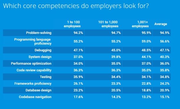 Les compétences recherchées par les employeurs changent peu selon la taille des entreprises. La capacité à être « problem solving » arrive en tête, suivent la compétence en programmation, le debugging, le system design et l’optimisation de la performance.