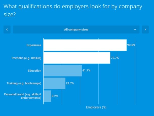 Pour juger les compétences des candidats, les entreprises scrutent principalement : l’expérience, le portfolio (Github), la formation. Le personal branding a très peu d’importance.