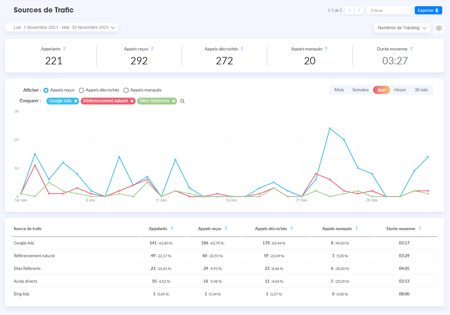 Toutes ces données vous permettent de facilement ajuster vos actions marketing selon leur efficacité, mais aussi de mieux connaître le parcours de vos clients : jours de pointe, répartition fixe / mobile, page de déclenchement de l’appel…