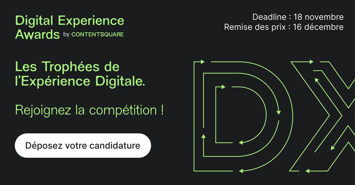 Contentsquare organise une nouvelle édition des Digital Experience Awards, un événement qui met en avant les entreprises et les équipes à l’origine des meilleures expériences digitales. Ouverte à toutes les marques, quel que soit leur secteur, cette compétition récompense les projets offrant la meilleure expérience utilisateur sur le web, le mobile ou en omnicanal. Vous avez jusqu’au 18 novembre pour candidater et mettre votre marque en valeur face aux leaders du secteur.