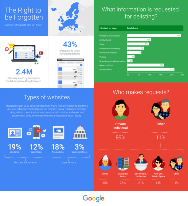 Depuis le 31 mai 2014, suite à la décision de la Cour Européenne de Justice sur le droit à l’oubli, Google permet à ses utilisateurs européens de faire une demande afin de déréférencer des résultats de son moteur de recherche. Dans une volonté de transparence, la firme met à disposition le rapport d’informations concernant les résultats de recherche supprimés dans le cadre de cette loi.