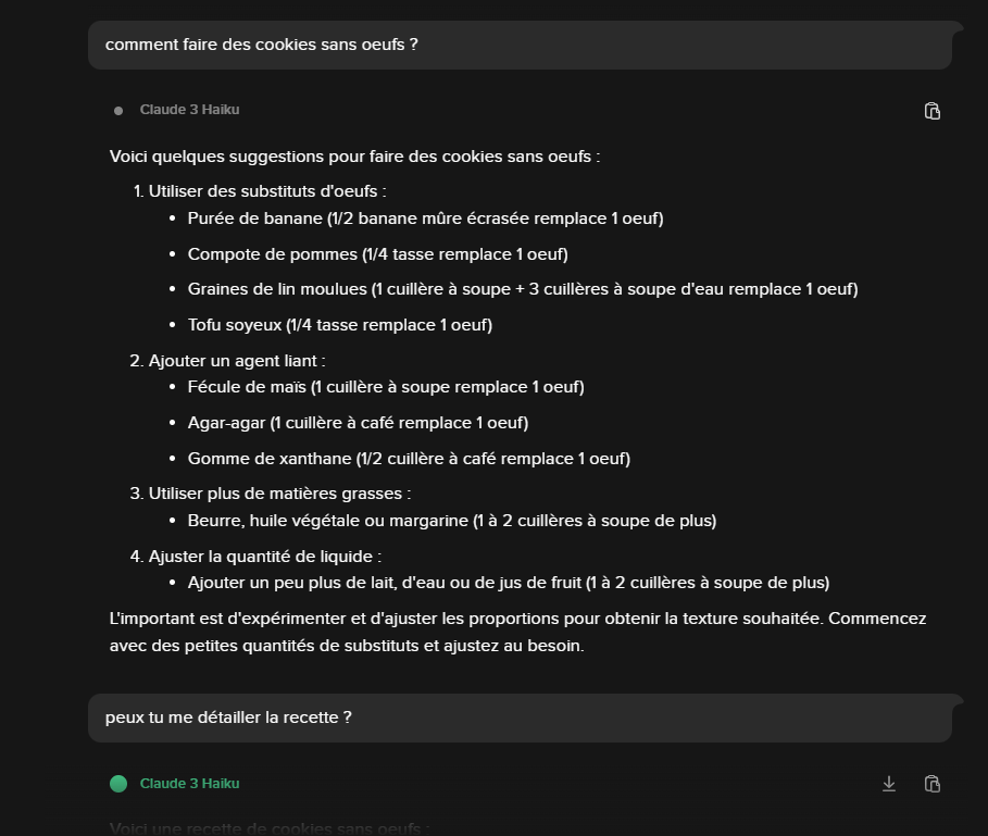 Duck.ai vous suggère également 4 propositions de requêtes à effectuer si vous êtes en manque d’inspiration. Celles-ci changent à chaque fois que vous ouvrez une nouvelle discussion. Par exemple, vous pouvez avoir comme suggestions :