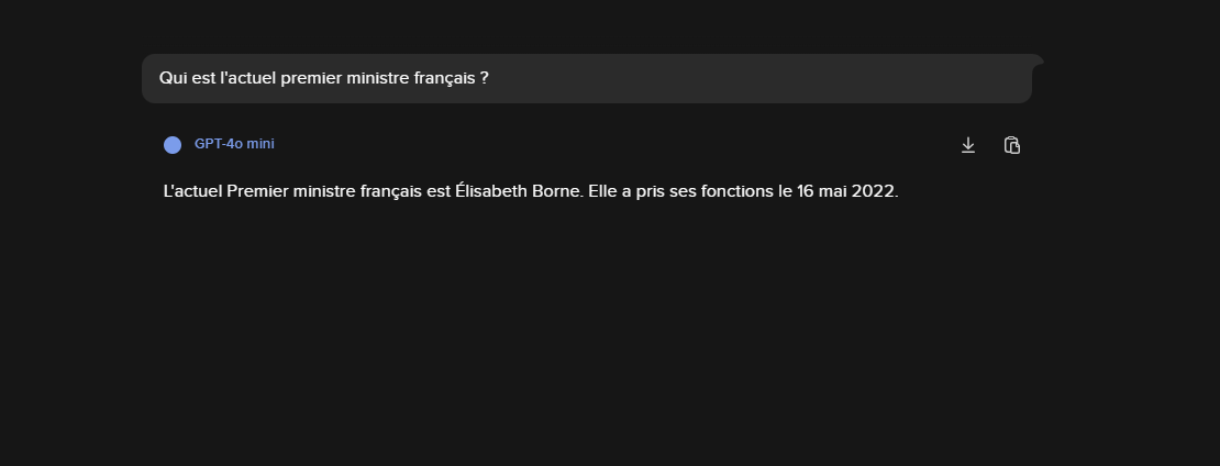 Pour le moment, il n’est pas possible d’importer des fichiers externes, comme des fichiers PDF, des photos ou des fichiers audio sur Duck.ai. L’outil ne dispose pas non plus de la recherche sur le web puisque sa dernière mise à jour date d’octobre 2023. Nous vous déconseillons de l’utiliser si vous souhaitez obtenir le nom de l’actuel Premier ministre ou sur des recommandations de films du moment.