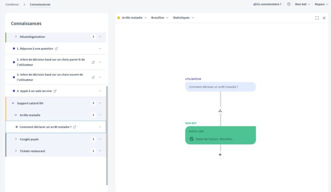 Très bien conçu, cet outil vous permettra de créer facilement vos bots, mais aussi de gérer votre base de connaissances, et de la mettre à jour en quelques clics. L’interface est intuitive et la création se fait de façon naturelle, même pour des scénarios complexes.