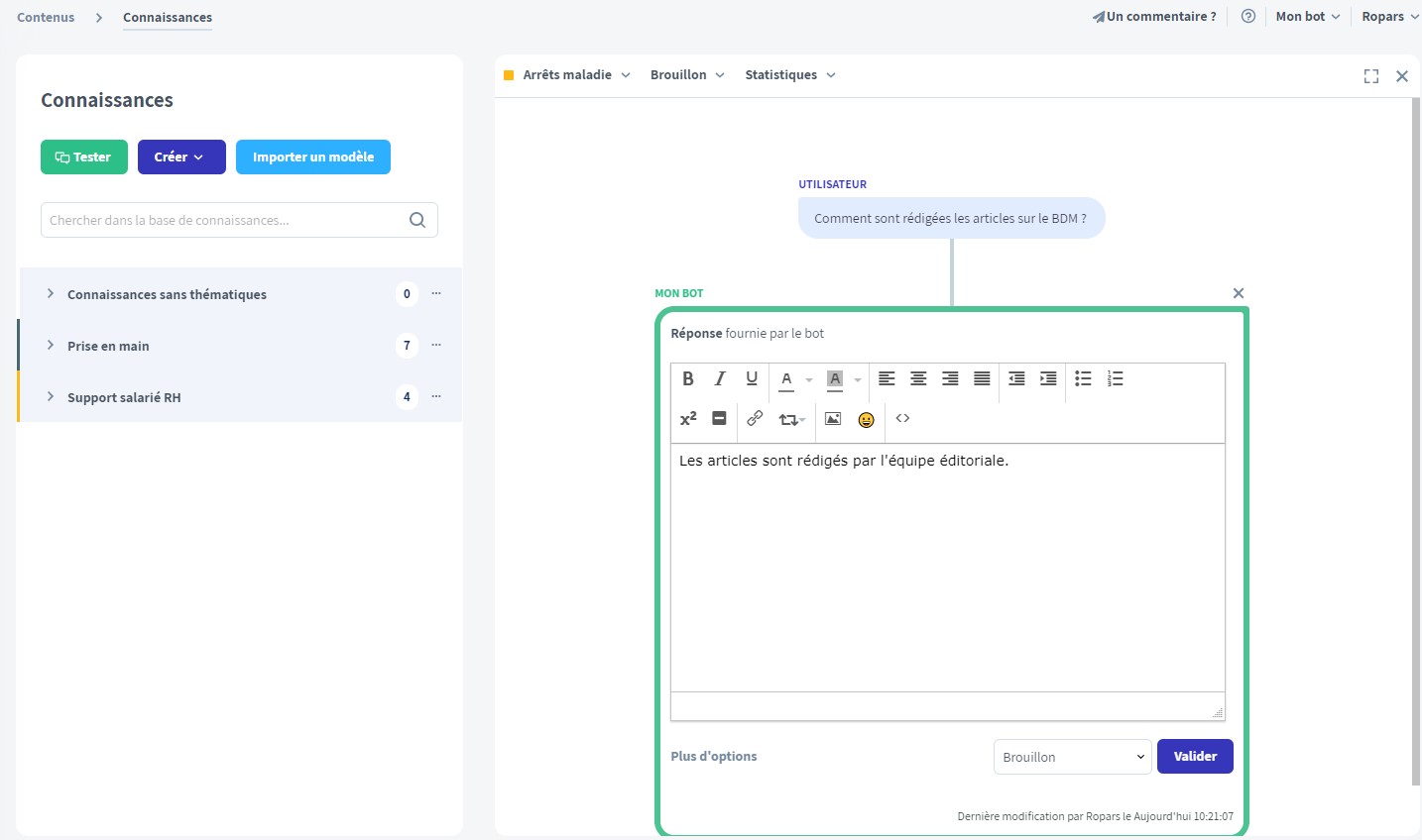 Vous ajoutez vos connaissances facilement grâce à l’éditeur de contenu, vous pouvez même ajouter des contenus « riches » dans les réponses du bot (liens, images, documents, vidéos, gifs…).
