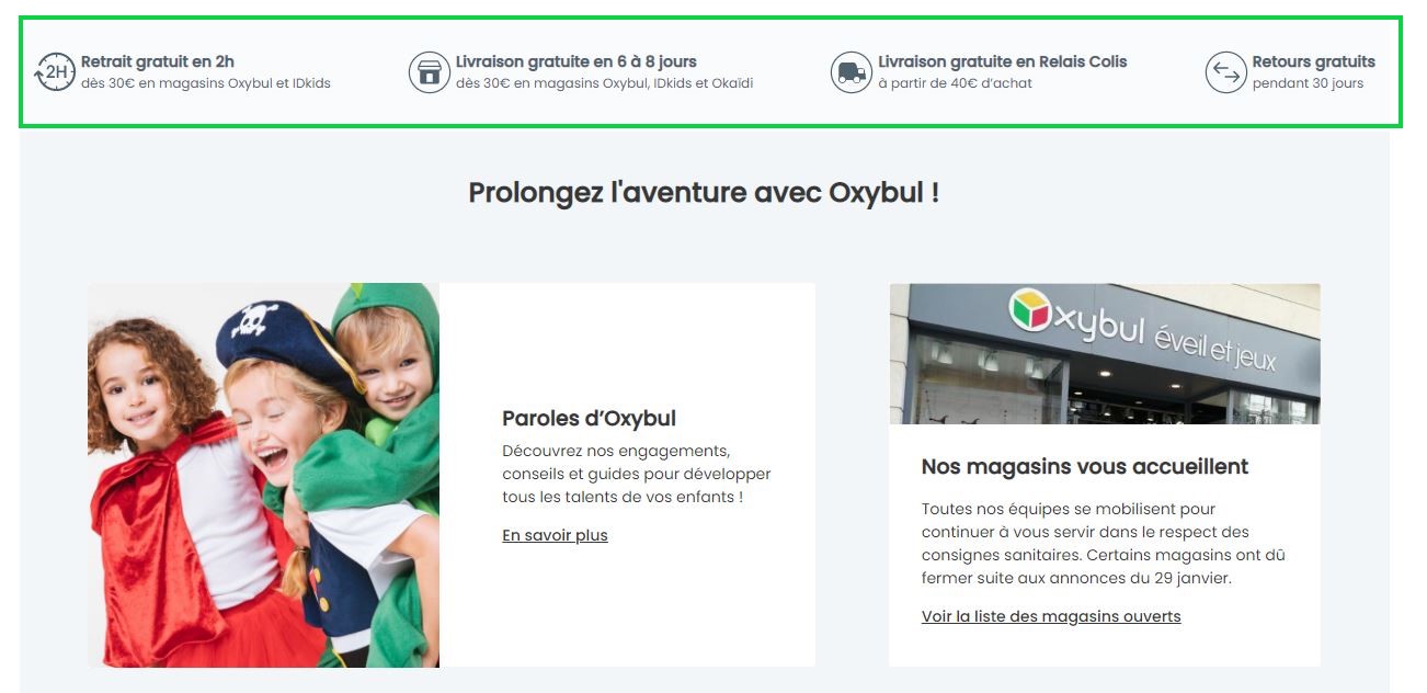 Si une personne se rend sur votre site pour vous contacter, elle a besoin de trouver un point de contact dès le premier coup d’œil. C’est pourquoi de nombreux sites e-commerce proposent un lien de contact dès la page d’accueil, soit dans le menu de navigation, soit à côté de l’icône panier en haut à droite, soit dans le footer. Une page dédiée au service client est une bonne pratique pour centraliser les informations de contact : numéro client, numéro des différents magasins, adresse email…