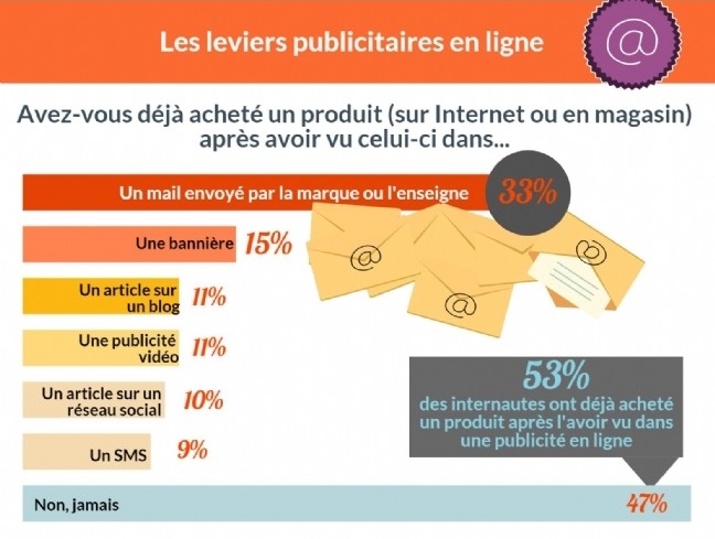 - Les internautes estiment que l’email est le levier publicitaire le plus efficace : 33% d’entre eux déclarent qu’ils ont acheté un produit après l’avoir vu dans un email envoyé par la marque.
