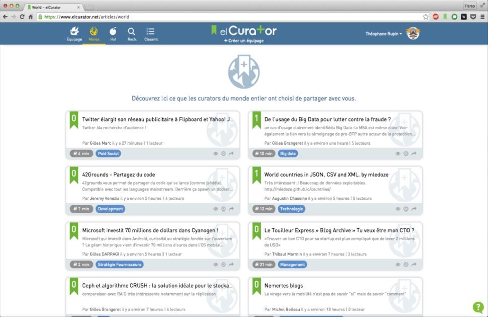 Pour de nombreux professionnels du web, la veille est un élément central mais n’est pas simple à mettre en place. Les sources et les formats se diversifient : réseaux sociaux, flux RSS, applications de curation, alertes, réseau professionnel… En entreprise, rassembler sa veille et partager les bonnes infos avec les bonnes personnes est important. Fin 2012, deux ingénieurs d’OCTO Technologies ont développé un outil interne afin de faciliter le partage d’informations. Baptisé elCurator, il est ouvert à tous depuis mai 2014. Nous l’avons testé et c’est franchement bien pensé.