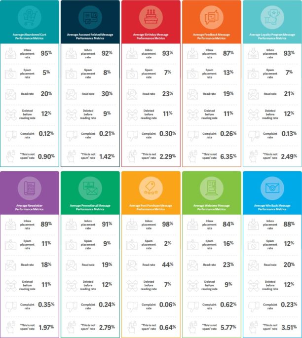 Return Path publie une étude très intéressante sur les performances des emails. Les statistiques de 600 000 emails commerciaux, envoyés par 3 000 entreprises, ont été analysées. Objectif : mesurer l’efficacité des newsletters, des messages de bienvenue, des emails déclenchés lors d’un abandon de panier ou lors d’un achat, des campagnes de ré-engagement (win back)… Les KPI choisis par Return Path sont le taux de placement en boîte de réception (vs. SPAM), les ouvertures, les suppressions avant ouverture, les placements en SPAM par l’utilisateur et le rapatriement des mails, des courriers indésirables à la boîte de réception.