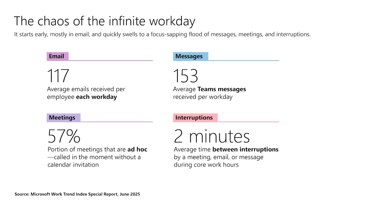 En moyenne, un professionnel est interrompu toutes les deux minutes par des emails, des messages ou encore une invitation à une réunion pendant sa journée de travail. C’est l’un des constats du rapport spécial du Work Trend Index, intitulé « Breaking down the infinite workday » et publié par Microsoft ce mardi 17 juin 2025. Cette enquête, qui complète les conclusions de son baromètre annuel, s’appuie à la fois sur « des signaux de productivité Microsoft 365 agrégés et anonymisés » et sur une enquête en ligne menée par un cabinet indépendant auprès de 31 000 salariés dans 31 pays.