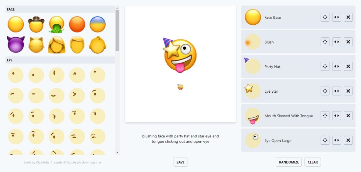 Au centre de l’interface, vous apercevez votre emoji personnalisé en fonction de vos envies. À droite, vous accédez à l’ensemble des éléments ajoutés à votre emoji. Vous pouvez les déplacer de haut en bas et même de droite à gauche, pour faire passer un œil ou un accessoire de l’autre côté du visage. Deux autres fonctionnalités : la possibilité de cliquer sur Randomize pour générer un emoji aléatoire et Clear pour recommencer la création de son emoji personnalisé.