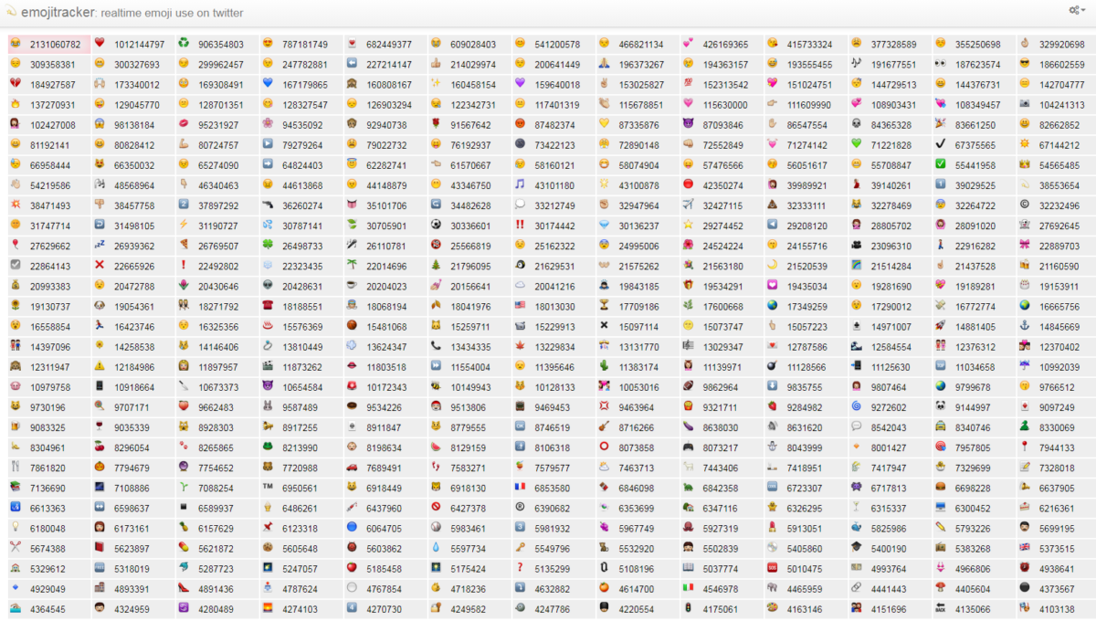 Toutes les données proviennent de emojitracker, un tableau de bord qui analyse tous les tweets à la recherche d’emojis depuis 2014. Le site suit 845 emojis approuvés et fournit des statistiques en temps réel sur leur usage. Sans surprise, le plus utilisé est le visage qui rit aux larmes.