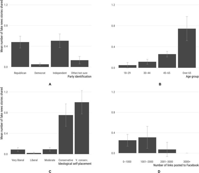 Parmi les premiers constats de l’étude, seuls 8,5% des personnes interrogées ont partagé une ou plusieurs infox, toutes tranches d’âge confondues. Le rapport montre cependant que les profils identifiés comme étant conservateurs ont plus tendance à partager des fake news que les profils libéraux. 18% des Républicains ont ainsi partagé des hoax, contre moins de 4% chez les démocrates. Des résultats qui selon les chercheurs se recoupent avec d’autres études, affirmant que la propagation des fake news a largement servi la campagne de Donald Trump.
