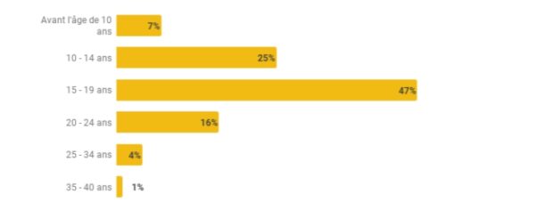 Les développeurs de l’étude ont tous commencé à développer jeune, voire très jeune. 7% ont commencé avant 10 ans, 25% entre 10 et 14 ans, et 47% entre 15 et 19 ans. 72% ont donc commencé la programmation entre 10 et 19 ans.