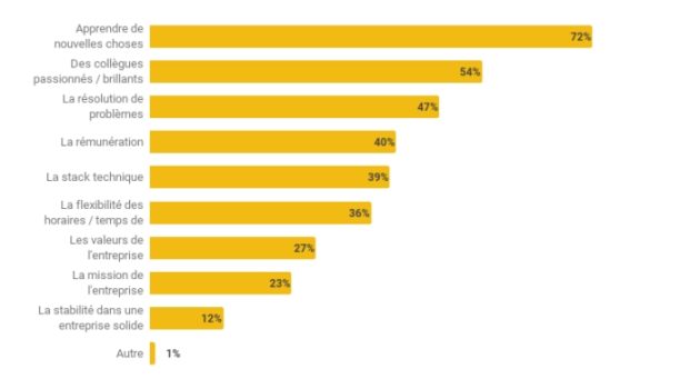 Les critères d’épanouissement les plus souvent donnés sont le fait d’apprendre de nouvelles choses, des collègues passionnés, la résolution des problèmes. La rémunération n’arrive qu’en 4ème position.