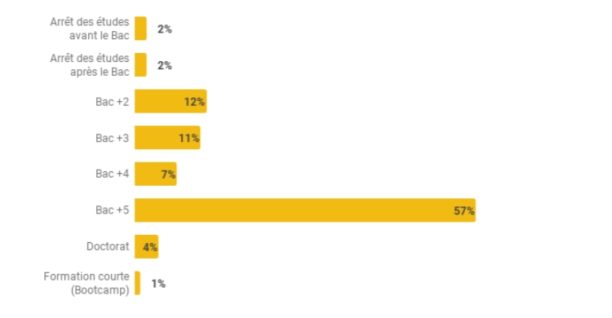 Sans surprise les développeurs ont majoritairement un Bac+5. On remarque néanmoins que les formations plus courtes permettent aussi d’accéder à ce métier.