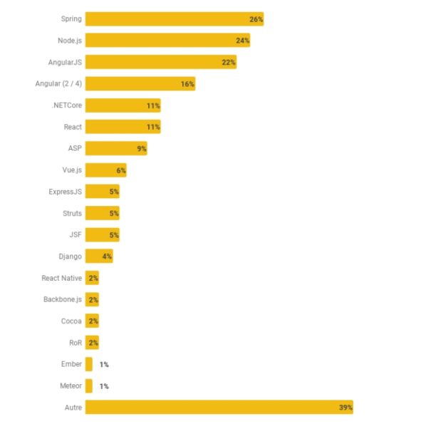Spring, Node.js, Angular JS, Angular, .NetCore sont les frameworks les plus utilisés.
