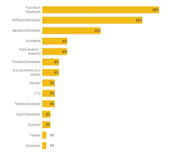 28% des répondants à l’étude se qualifient de « développeurs Full Stack », poste qui englobe back et front end. Les « développeurs généralistes » sont 24%, les développeurs backend sont 14%, et les « front » ne sont que 4%