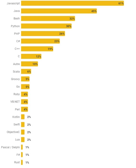 Javascript, Java, Bash, Python et PHP sont les 5 langages les plus utilisés au travail selon les développeurs interrogés.
