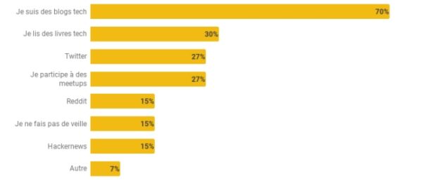 Les canaux les plus utilisés pour la veille chez les développeurs sont : les blogs tech, les livres tech, Twitter, les meetups et Reddit. 15% des développeurs ne font pas de veille.