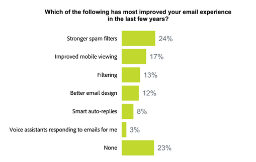 Pour commencer, le ressenti des Français sur les améliorations connues par leur boite mail ces dernières années en dit long sur leur vision des emails commerciaux. 24% trouvent les filtres à spams plus pertinents, et le 13% apprécient le filtrage. Sa capacité à s’adapter au mobile arrive également très haut.