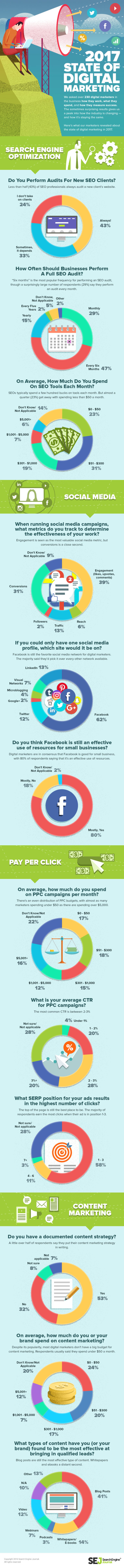 Search Engine Journal, media de référence des référenceurs, publie les résultats d’une enquête réalisée auprès des professionnels du SEO, du SEA, du Social Media et du contenu. Il ne s’agit pas d’une étude d’ampleur, mais elle permet de faire le point sur un certain nombre de problématiques, des réseaux sociaux préférés des marketeurs aux budgets consacrés aux outils B2B. Une infographie, insérée en bas de cet article, résume les principaux résultats de l’enquête SEJ.