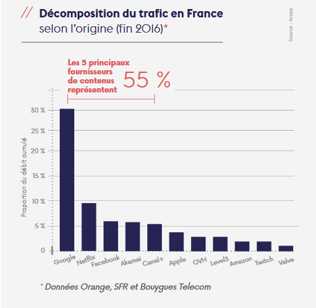 Les 5 principaux fournisseurs de contenus que sont Google, Netflix, Facebook, Akamai et Canal+ représentent 55 % du trafic en France. Google prend la tête avec 30 % suivi par Netflix à 9 % et Facebook à 6 %. À noter qu’Apple, Amazon et Twitch figurent également dans le top 10, représentant moins de 5% du trafic.