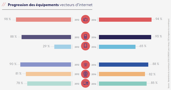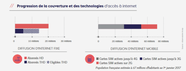 Pour l’Internet fixe, 20 millions de personnes sont abonnées au haut débit (ADSL). Environ 5 millions de personnes sont abonnées au très haut débit (fibre optique) sur les 15 millions de foyers éligibles. « 82 % des Français disposent désormais d’un ordinateur à leur domicile et 85 % bénéficient d’un accès à internet fixe, soit un niveau d’équipement presque équivalent à celui du téléphone fixe (88 %) ». En ce qui concerne l’Internet mobile, environ 70 millions de cartes SIM donnent accès à Internet. 30 millions de personnes bénéficient d’un forfait 4G, 25 millions d’un forfait 3G et 15 millions d’un forfait 2G. Toujours selon l’étude, « en matière de mobile, 92 % des Français possèdent leur propre terminal, dont deux tiers de smartphones. »