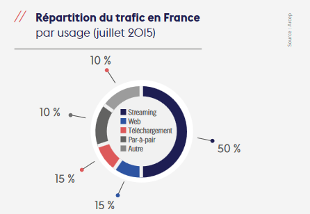 Selon l’étude, le streaming est de loin la première source de trafic en France représentant ainsi la moitié du trafic global. Viennent ensuite la navigation web et le téléchargement avec 15 % chacun, suivis par le P2P et d’autres sources qui ferment la marche avec 10 %.