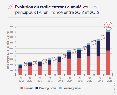 Autre donnée importante mise en avant par l’étude, le trafic Internet entrant chez les 4 principaux fournisseurs d’accès que sont Orange, SFR, Bouygues et Free. On constate que ce trafic a quadruplé en 4 ans, passant ainsi de 2,1 Tb/s à 8,4 Tb/s.