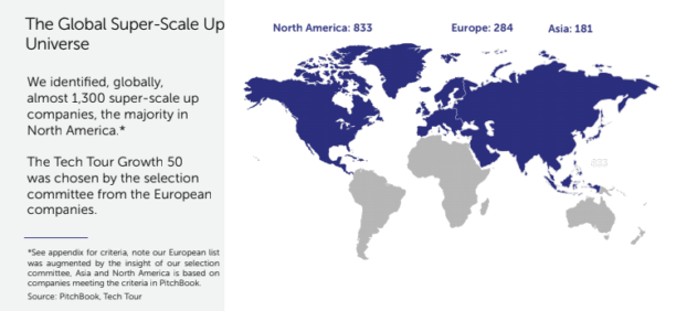 Tech Tour et Pitchbook ont globalement identifié 1300 super-scaleups dans le monde. Le plus grand vivier est de loin l’Amérique du Nord, qui en dénombre 833. L’Europe arrive en seconde position avec 284 sociétés identifiées, suivie par l’Asie où l’on en comptabilise 181. A noter que 58% d’entre elles sont orientées B2B, 42% B2C.