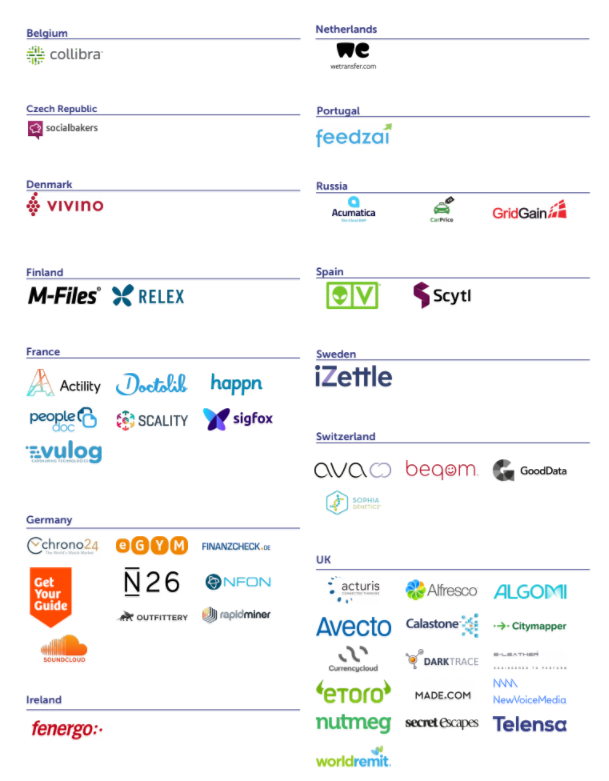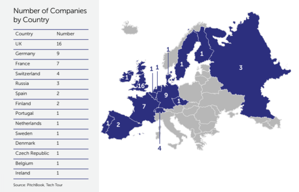 Parmi les 50 super-scaleups européennes les plus prometteuses, les pays les mieux représentés sont : le Royaume-Uni (16), l’Allemagne (9) et la France (7). Viennent ensuite la Suisse (4), la Russie (3), l’Espagne, la Finlande (2)…