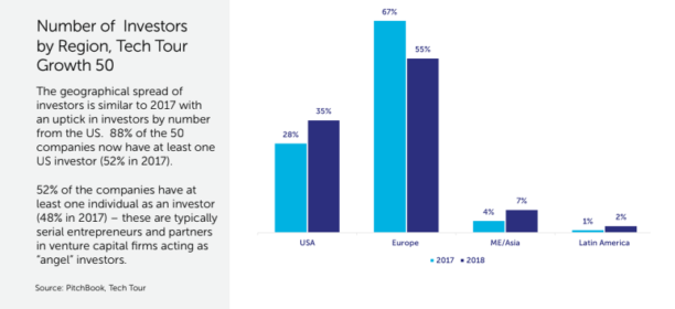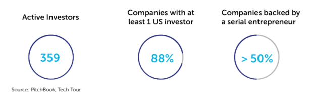En ce qui concerne les investisseurs, on apprend qu’ils sont 359 à être considérés comme actifs. On apprend également que plus de la moitié des 50 sociétés sont soutenues par un « serial entrepreneur », et que 88% d’entre elles s’appuient sur l’aide d’au moins un investisseur américain.