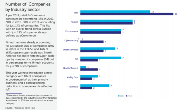 L’an passé, les super-scaleups spécialisées dans le Saas étaient déjà dominantes, avec 12 sociétés comptabilisées. Le secteur conforte sa 1ère place cette année avec l’arrivée de 4 nouvelles compagnies. En ce qui concerne la Fintech et le E-Commerce, pas de changement entre 2017 et 2018. On dénombre toujours 9 et 7 super-scaleups qui exercent dans ces domaines respectifs. L’arrivée de nouveaux secteurs porteurs comme la cybersécurité et la santé/biotech est à noter, de même que le déclin de l’IoT, de l’hardware et des autres softwares qui enregistrent moins de sociétés cette année par rapport à l’an passé.