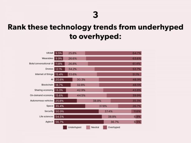 La VR, les wearables, les bots et les drones seraient survendus alors que la sécurité, les Life sciences, et Agtech souffriraient d’un déficit d’image.
