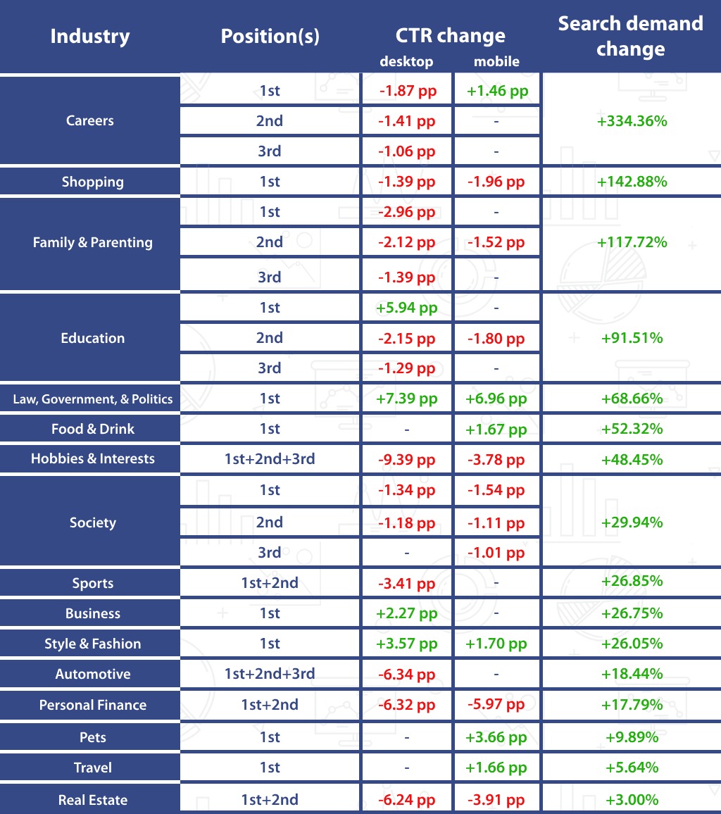 Le secteur des arts et du divertissement connaît une baisse du CTR sur ordinateur, mais une légère hausse sur mobile. Enfin, le secteur de la santé et du fitness affiche une baisse sur ordinateur, mais une hausse du CTR en première position sur mobile. En somme, la baisse de la recherche entraîne en général moins de trafic.