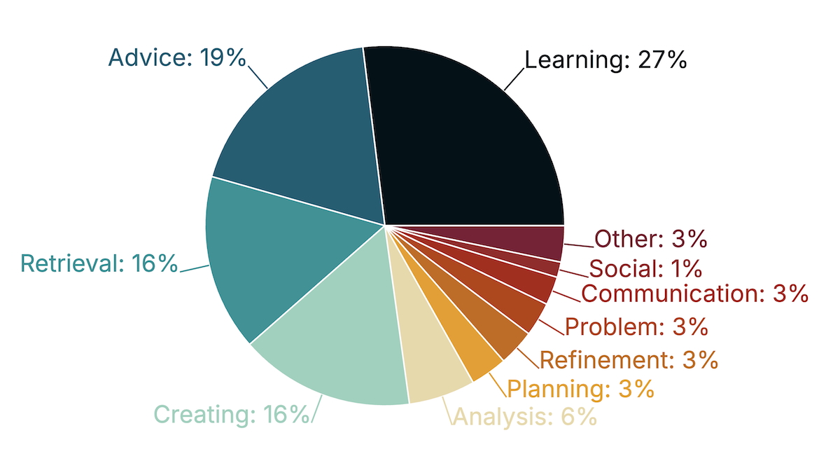 Au-delà de ce rapport collaboratif à l’IA, l’étude met en évidence la diversité des tâches confiées aux modèles. Quatre grands types d’usage dominent (voir image de une) :