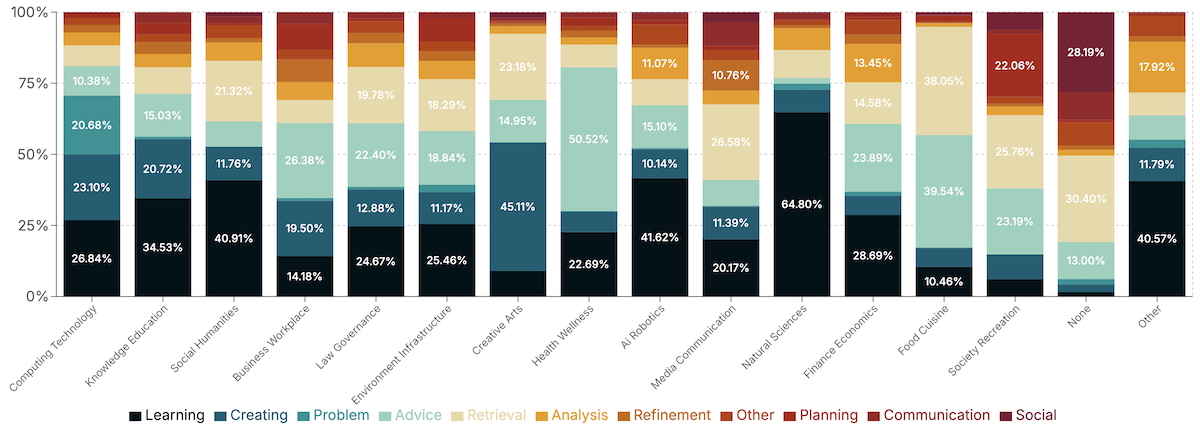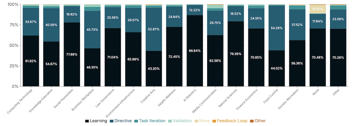 Cette tendance confirme l’idée que l’IA conversationnelle n’est pas seulement perçue comme un outil d’exécution, mais bien comme un « partenaire d’apprentissage collaboratif ». L’étude montre par exemple que les utilisateurs et utilisatrices sollicitent l’IA pour explorer un concept scientifique (79 % des interactions en sciences relèvent de l’apprentissage) ou développer une réflexion en sciences humaines (78 %). À l’inverse, dans les domaines créatifs, la moitié des échanges (53 %) prennent la forme de demandes directes de production de contenu, comme l’écriture d’une histoire.