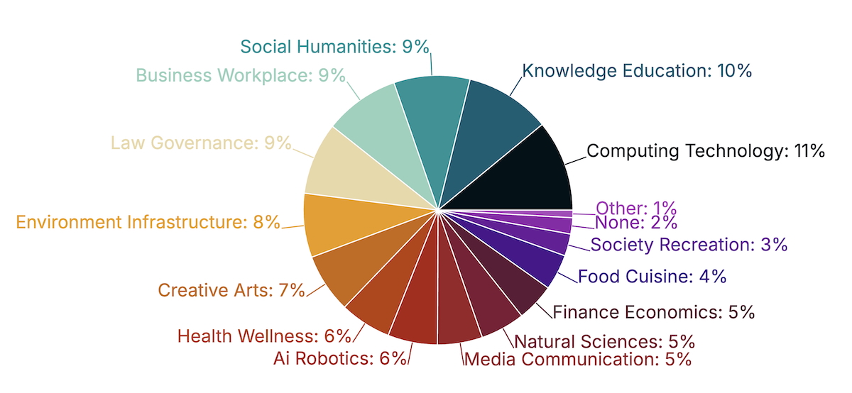 Les thématiques abordées sont elles aussi variées. Les conversations liées aux technologies (programmation, configuration matérielle, cybersécurité) représentent 11 % du corpus, suivies de près par l’éducation et l’apprentissage (10 %). Trois autres domaines se partagent 9 % chacun : les sciences humaines et sociales, le monde du travail et la sphère juridique et politique. La santé et le bien-être, les arts, l’économie ou l’alimentation apparaissent également dans les échanges, ce qui confirme que l’IA s’immisce dans de nombreux aspects de la vie quotidienne.