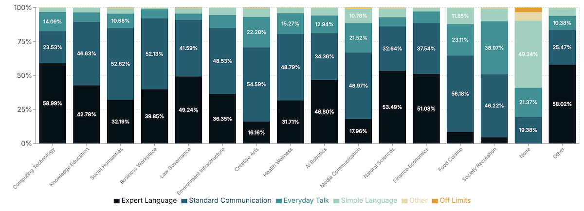 L’étude souligne aussi que la complexité du langage varie fortement selon les thématiques. Les domaines techniques (technologies, sciences, droit, économie) mobilisent un vocabulaire spécialisé et des formulations expertes, tandis que les échanges autour de la cuisine, des arts ou des loisirs adoptent un registre plus simple et conversationnel. Cette adaptation témoigne d’une appropriation naturelle de l’IA par les utilisateurs et utilisatrices, qui ajustent leur manière de discuter en fonction du contexte.