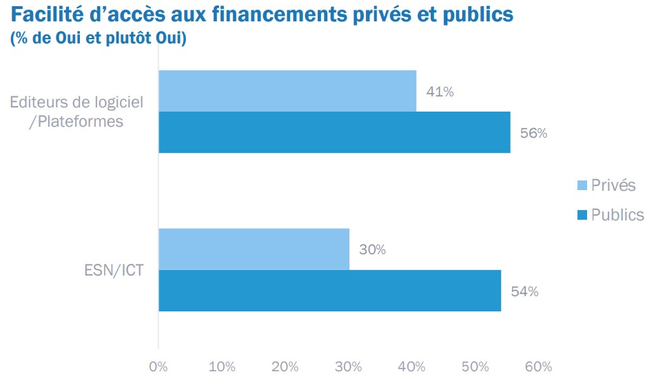 À l’inverse, l’accès aux financements privés est jugé plus difficile par les entreprises, dont seulement 40 % estiment qu’il est « facile à plutôt facile » d’obtenir ce type de financement. Ainsi, les fonds propres des entreprises restent la première source de financement pour la recherche et le développement, mobilisés par 70 % d’entre elles.