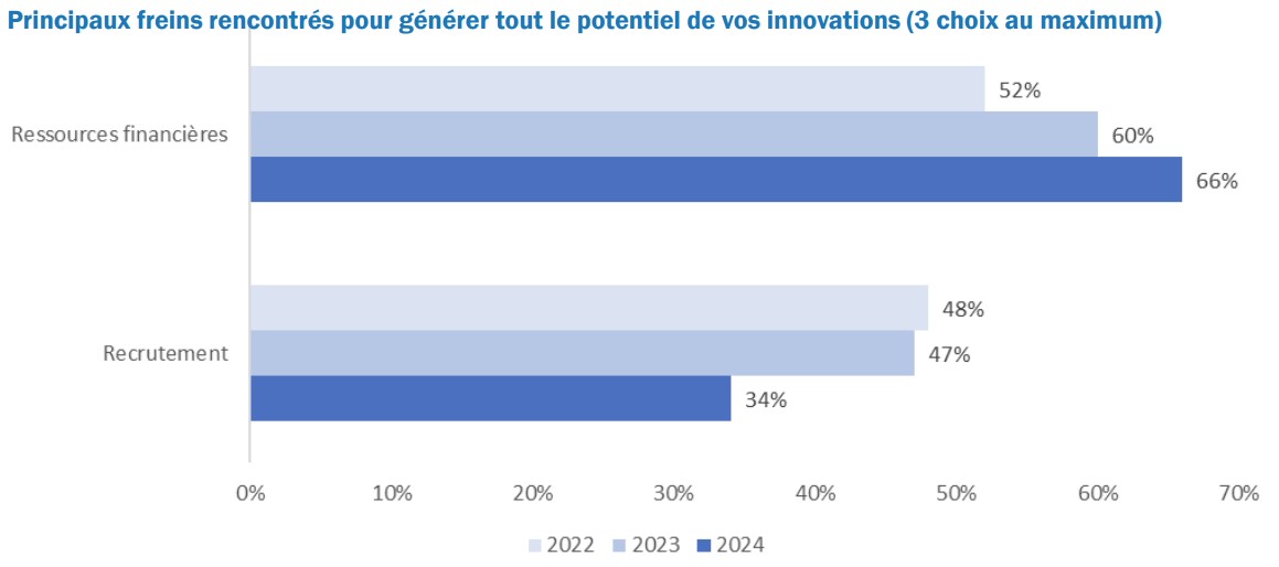 Parmi les principaux freins à l’innovation mentionnés par les répondants, le manque de ressources financières augmente significativement au fil des années, tandis que les freins liés au recrutement semblent moindres. En outre, les délais de remboursement des crédits d’impôt constituent une barrière pour les entreprises, en particulier les PME, dont 48 % affirment que le remboursement de leur créance dépasse sept mois.
