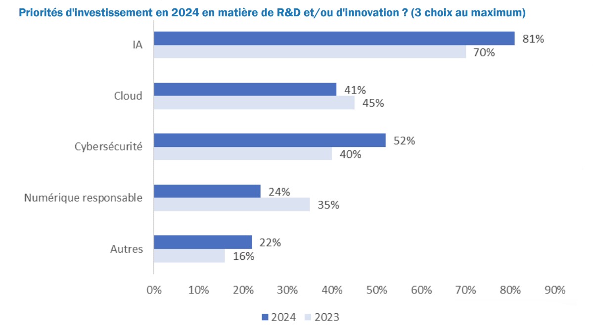 En 2024, l’IA était considérée comme une priorité d’investissement par 81 % des entreprises répondantes, soit 11 points de plus qu’en 2023. Toutefois, Numeum alerte sur le risque que la ruée vers l’IA nuise aux autres secteurs, dont certains, comme le cloud ou le numérique responsable, connaissent un ralentissement.