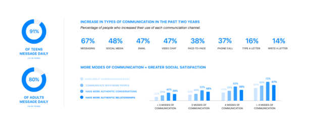 - Plus il y a de modes de communication, meilleure est la satisfaction sociale. Les sondés rapportent que plus les outils se multiplient, plus leurs conversations sont authentiques et de qualité.