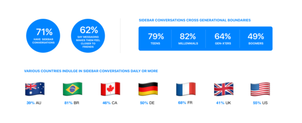 - De plus en plus de personnes (71%) admettent converser de cette manière. 62% des sondés affirment que ce procédé leur donne l’impression de se rapprocher de leurs amis, tandis que 79% des adolescents et 82% des millenials se disent adeptes de ce type d’échanges.