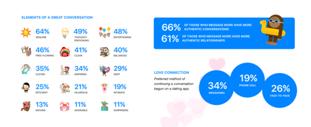 - 66% de ceux qui passent par une messagerie pour communiquer affirment avoir des conversations plus authentiques. 61% d’entre eux caractérisent leurs relations de la même façon.